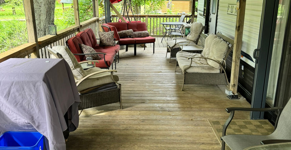 full 4o foot deck with corner deck/shed behind trailer to keep everything off the ground. Over 400 sq ft of living space outdoors!